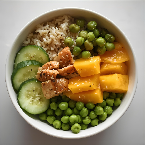 - Bowl to go: Quinoa oder Vollkornreis, viel Gemüse, Hühnchen oder Kichererbsen.